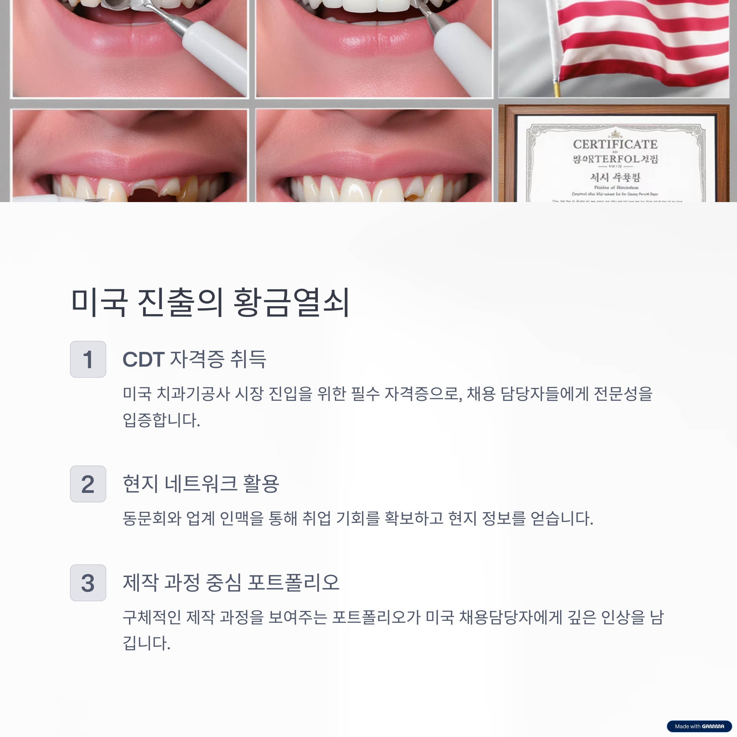 미국, 호주, 캐나다에서 성공한 치과기공사들의 사례를 살펴보면, 포트폴리오가 결정적인 역할을 했습니다. 단순히 작업물을 나열하는 것이 아니라, 제작 과정과 본인의 강점을 구체적으로 설명한 포트폴리오가 현지 채용 담당자들의 신뢰를 얻는 핵심이었습니다. 특히, 영문 포트폴리오 준비는 필수이며, 사진, 재료, 공정 설명이 포함된 상세한 구성이 요구됩니다. 포트폴리오를 통해 자신의 기술과 소통 능력을 동시에 보여줄 수 있어야 해외 취업의 문이 열립니다.